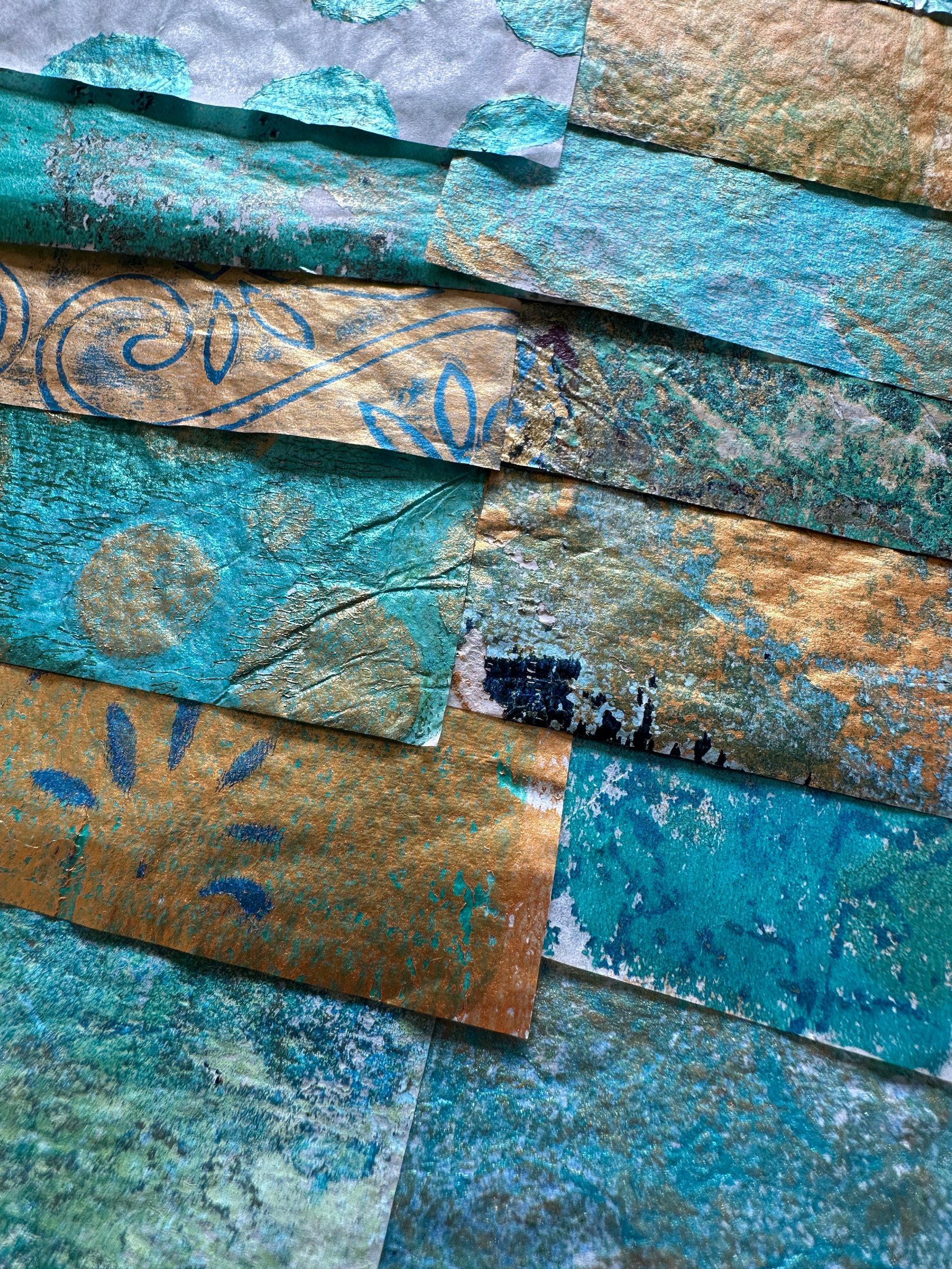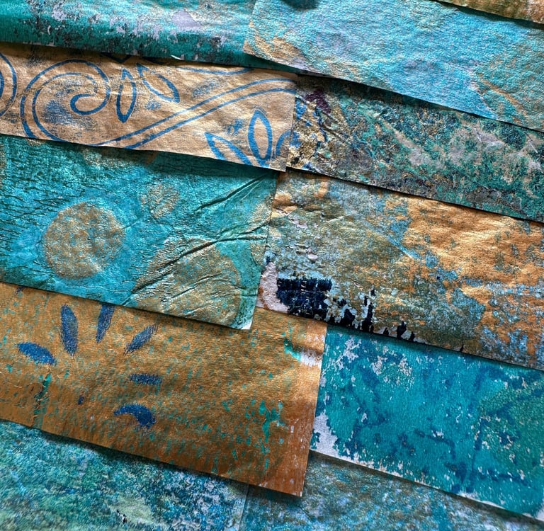 I create both hand-painted collage papers and printable digital papers designed to work beautifully in collage, journaling, and mixed media projects.